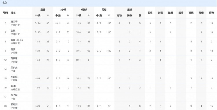 北京隊(duì)方面,張帆16分1籃板3助攻,廖三寧15分3籃板9助攻3搶斷,翟曉川15分8籃板2助攻2搶斷。