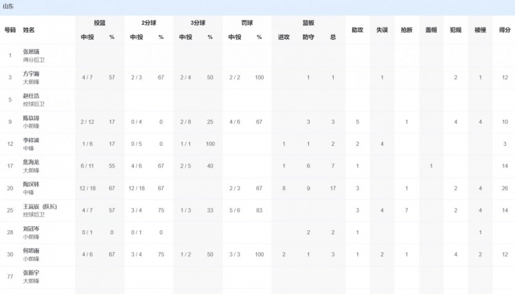 山東隊(duì)方面,陶漢林26分17籃板3助攻1搶斷,王嵐嵚14分3助攻7搶斷,焦海龍14分7籃板1助攻。
