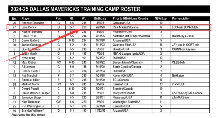 從名單中可以看到,東契奇體重為244磅(110kg)。而值得一提的是,上賽季東契奇開賽時的體重為230磅(104kg)。