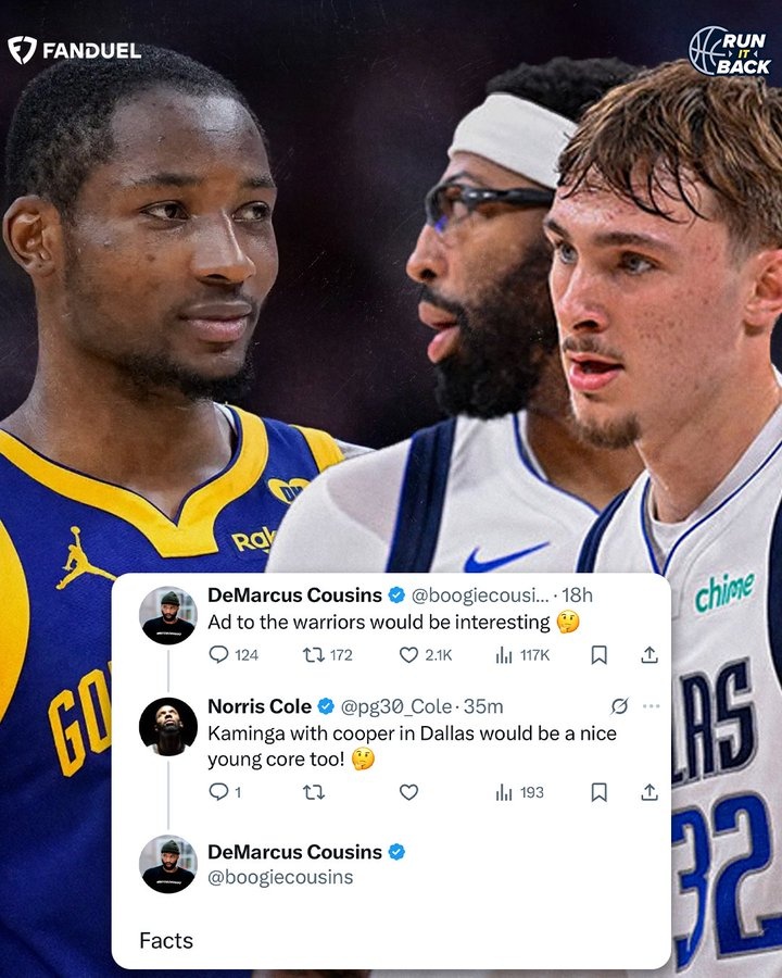 前NBA球員諾里斯·科爾在考辛斯這條推特的評(píng)論區(qū)回復(fù)道:“庫明加和弗拉格能在達(dá)拉斯組成一個(gè)不錯(cuò)的年輕核心陣容!”