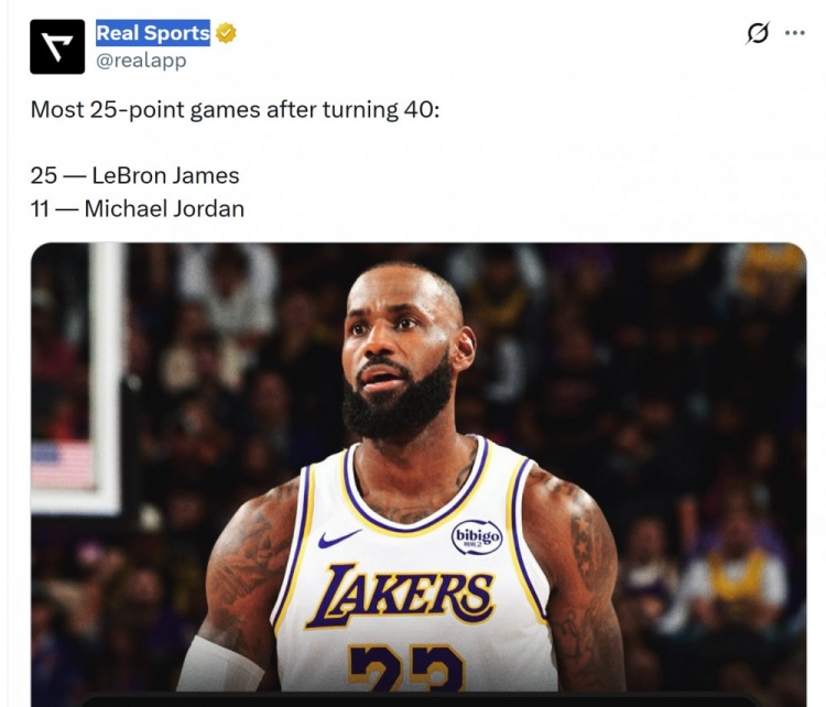 賽后美媒Real Sports曬出數(shù)據(jù)顯示,詹姆斯40歲后已25次砍下25+,而喬丹共11次。