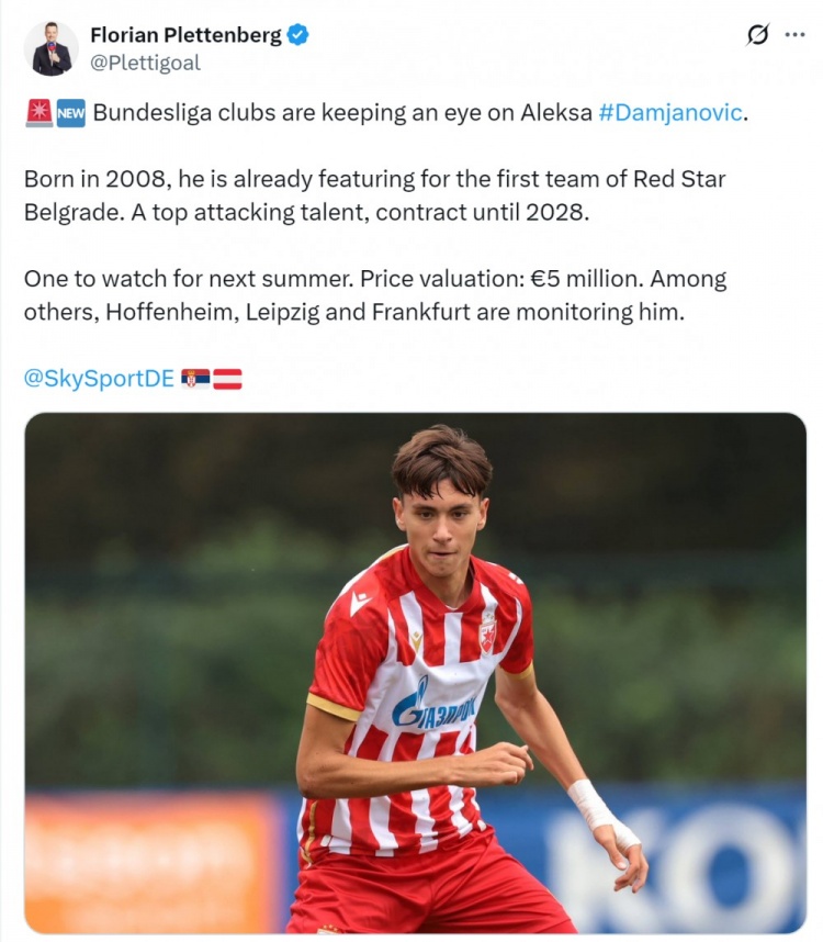 普萊滕伯格指出,16歲前鋒達(dá)姆賈諾維奇已經(jīng)為紅星一線隊(duì)出場,他與俱樂部的合同2028年到期。這位小將明夏的動(dòng)向值得關(guān)注,球員估價(jià)500萬歐元,霍芬海姆、萊比錫、法蘭克福等俱樂部都在關(guān)注球員。