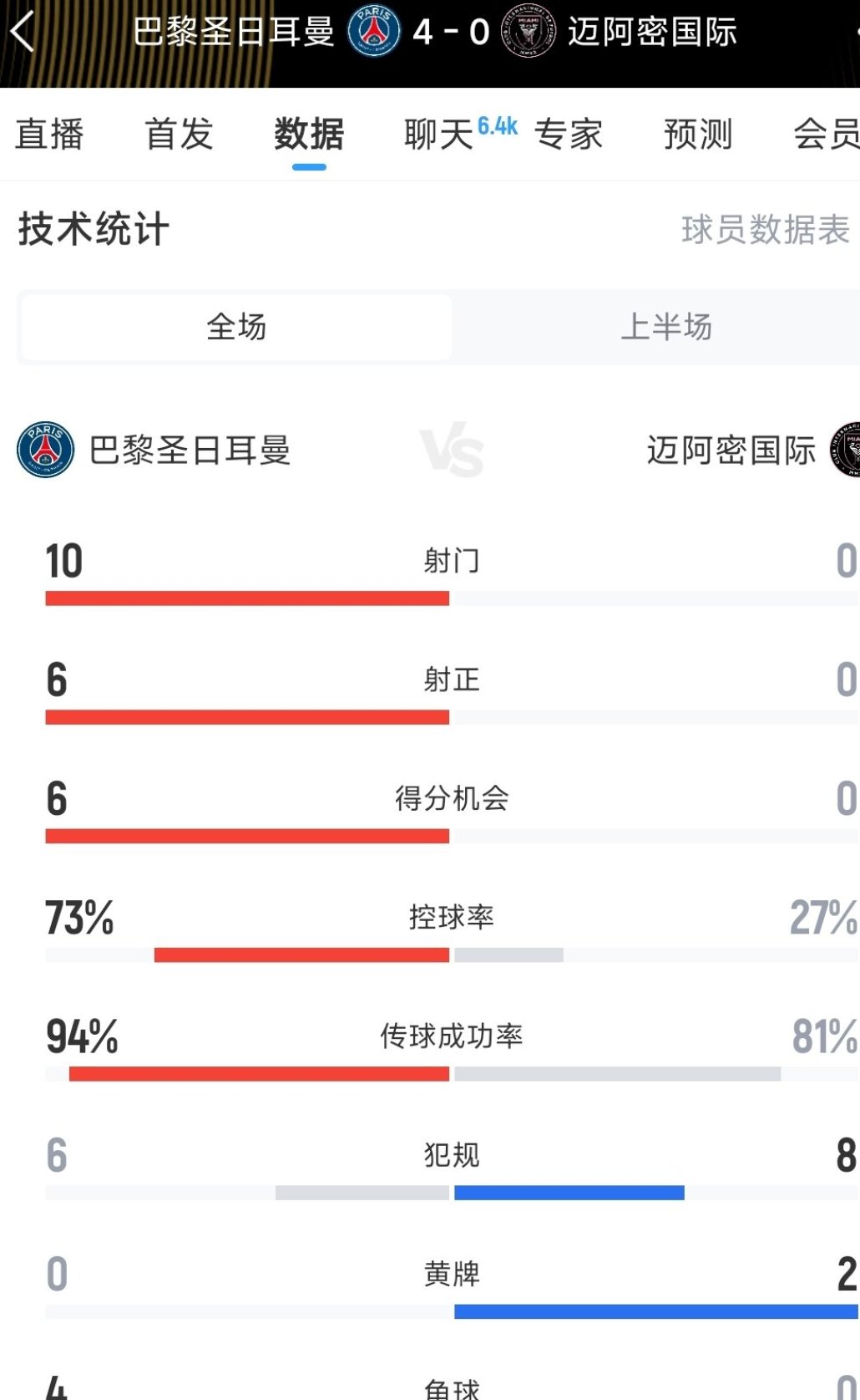 06月30日訊 世俱杯1/8決賽,巴黎圣日耳曼vs邁阿密國際。上半場比賽結(jié)束,巴黎4-0領(lǐng)先邁阿密。半場數(shù)據(jù)如圖所示。