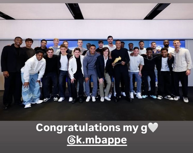 貝林厄姆也通過(guò)社媒曬出了皇馬全隊(duì)同手持金靴獎(jiǎng)杯姆巴佩的合影,并配文:“祝賀我的兄弟@姆巴佩”。