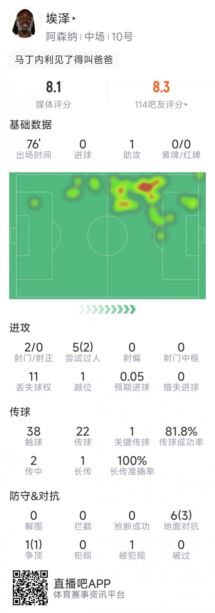 9月13日訊 在本輪英超阿森納對(duì)陣諾丁漢森林的比賽中,埃澤表現(xiàn)出色,以下為他在本場(chǎng)數(shù)據(jù):