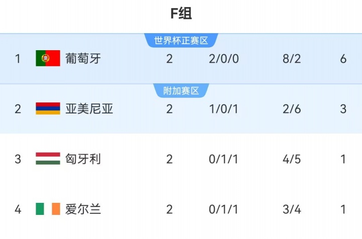 世預賽歐洲區(qū)F組積分榜↓
