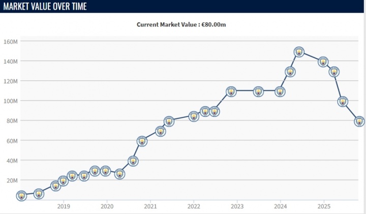 本賽季福登代表曼城各賽事出戰(zhàn)13場(chǎng)比賽,貢獻(xiàn)5粒進(jìn)球和3次助攻。目前25歲的福登德轉(zhuǎn)身價(jià)為8000萬歐元,而在2024年同期,正值巔峰的福登最高身價(jià)曾達(dá)到1.5億歐。在過去的1年時(shí)間里,福登的身價(jià)下跌了7000萬歐元。