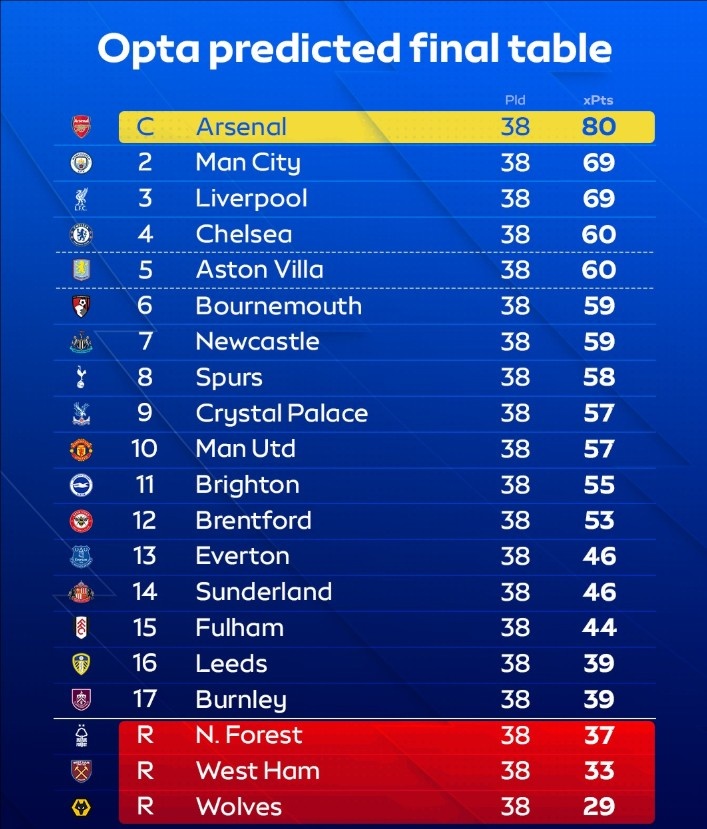 10月31日訊 Opta數(shù)據(jù)給出了最新一期的2025/26賽季英超聯(lián)賽最終排名預(yù)測(cè),阿森納奪冠。