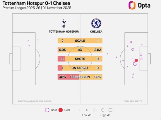 11月2日訊 英超第10輪比賽,熱刺在主場以0-1的比分不敵切爾西。本場比賽,熱刺的預(yù)期進(jìn)球數(shù)僅為0.05。