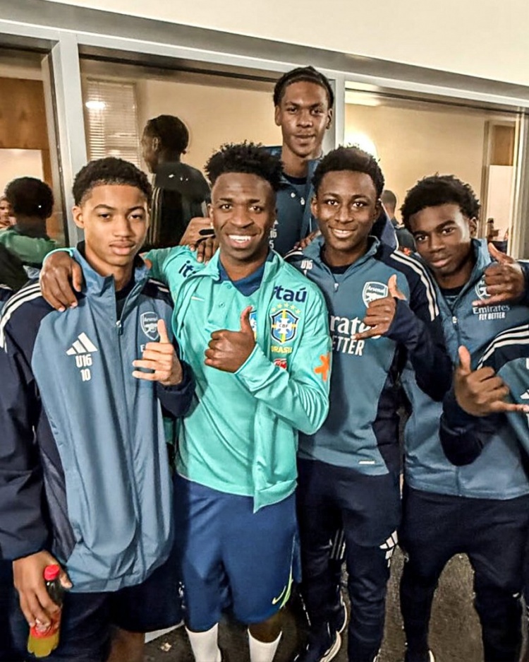 維尼修斯隨巴西隊在阿森納基地訓練,備戰(zhàn)這場友誼賽,他與阿森納的青訓球員合影。