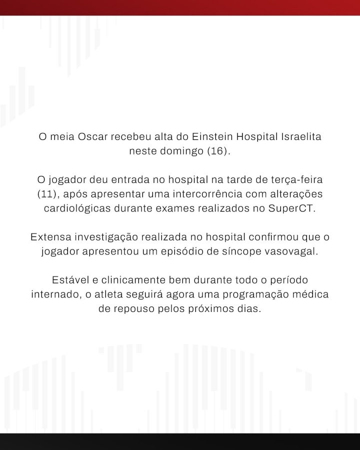 當(dāng)?shù)貢r(shí)間11月11日,巴甲聯(lián)賽球隊(duì)圣保羅官方發(fā)布公告聲明稱,34歲的奧斯卡在體檢中暈厥, 被檢查出心臟異常情況,隨后他被送往醫(yī)院。