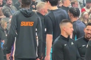 兄弟,一路平安!楊瀚森賽前和馬盧阿奇合影,中間球迷穿夏普球衣